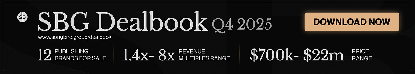 A shout out to today’s sponsor, Songbird.Group (SBG) M&A, who specialise in the sale of publishing businesses. Their newly released SBG Dealbook (Q4 2025) includes a portfolio of 12 current, privately listed, media and publishing brands, with target exit-sale prices ranging from $700k USD to $22M and revenue multiples between 1.4x - 8x.