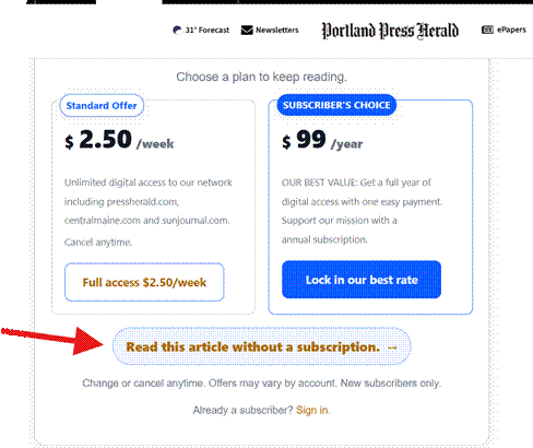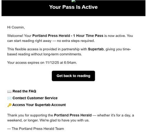 At Portland Press Herald, the Maine publisher which has successfully trialed the technology, Supertab appears below the standard subscription call-to-action. Readers not ready to subscribe are offered timed access: one hour, 24 hours, or a week.