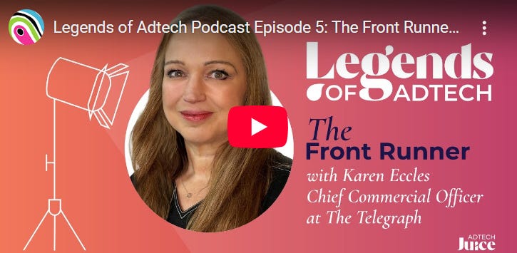 As publishers grapple with AI, declining ad revenues, and shifting reader habits, the need for clarity and direction has never been greater. On the Legends of Adtech podcast from Adtech Juice, Karen Eccles, Chief Commercial Officer at The Telegraph, offered a rare account of what it takes to steer one of the UK’s most prestigious, legacy news brands…including her own personal journey.